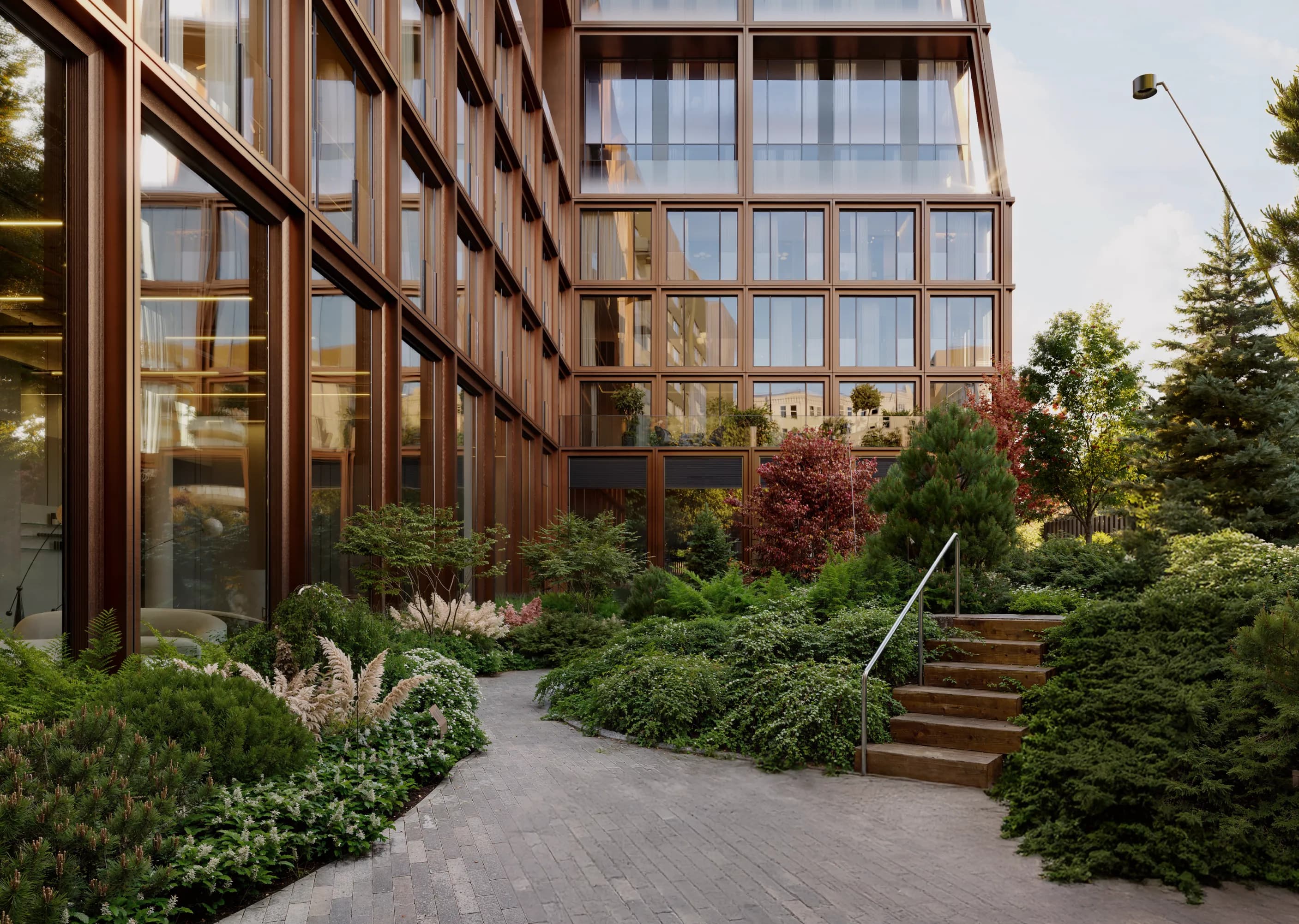 и извилистые прогулочные дорожки формируют атмосферу камерного скандинавского сада. Сад словно живёт своей жизнью: здесь рассеянный свет, тенистые уголки, запах смолы и мягкое движение листвы. Вечером включается деликатная подсветка, превращая двор в тихую световую сцену.