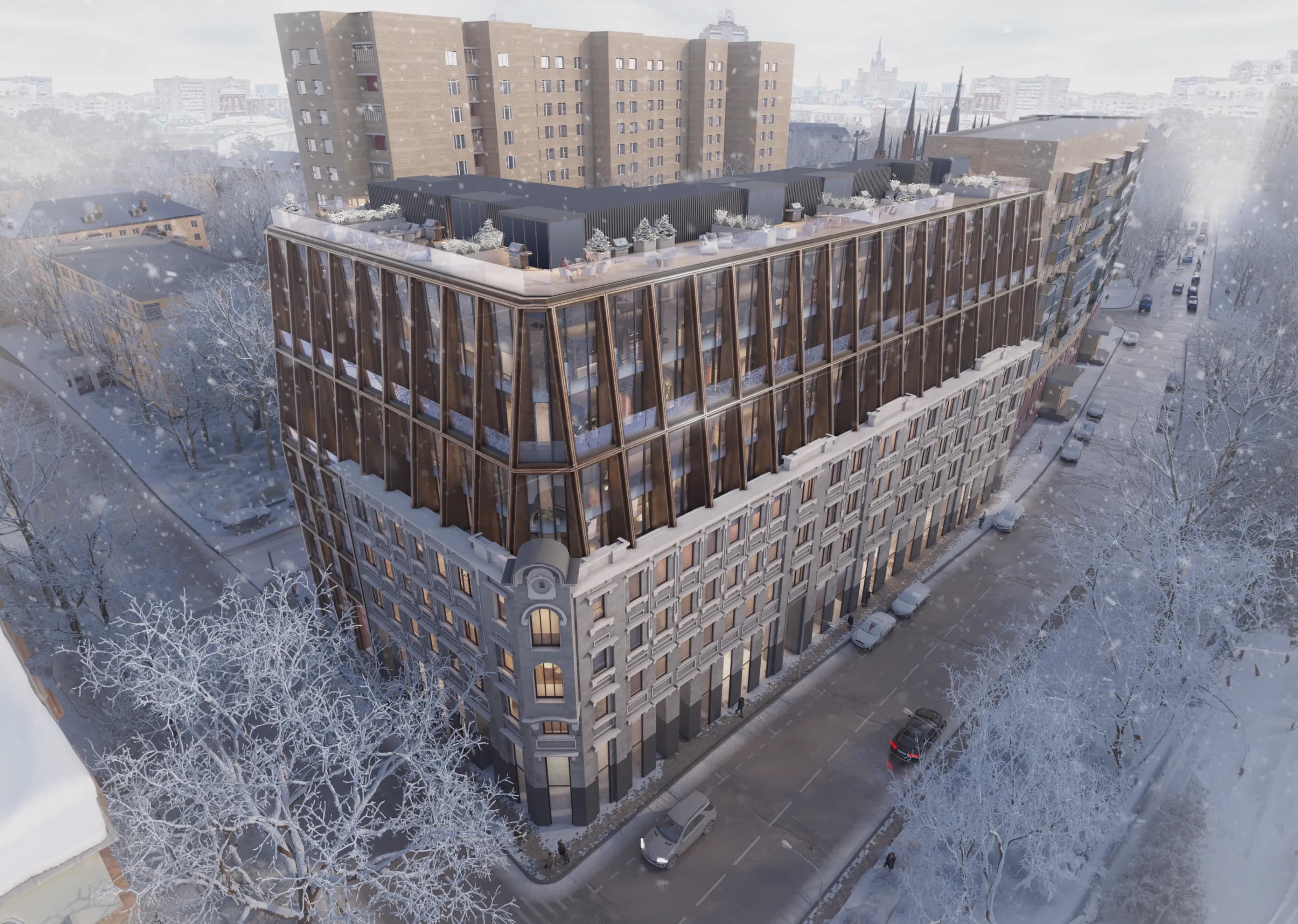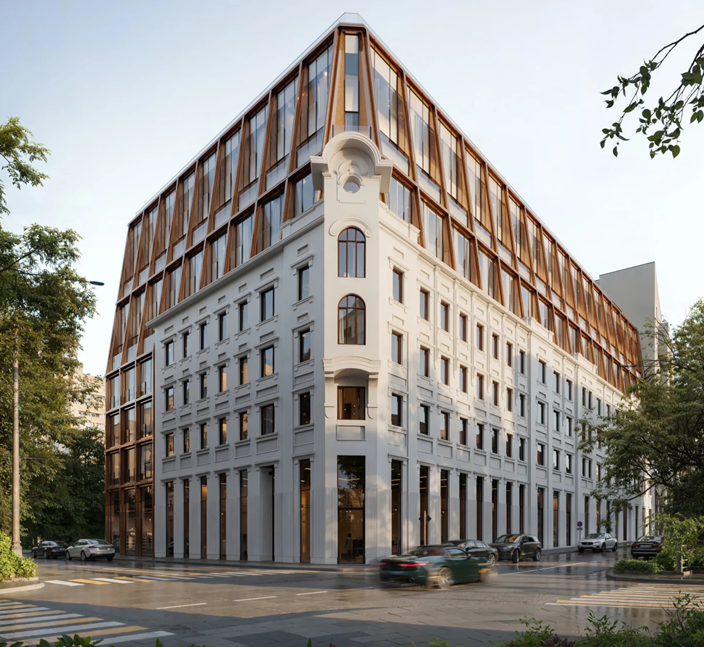 «Сочетание исторического фасада и его подчеркнуто современного продолжения — всегда важная и интереснейшая для архитектора задача, которая должна привести к контрастной гармонии прошлого и настоящего, обогащающей панораму района».