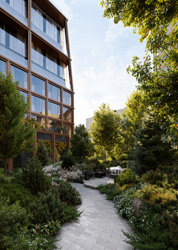 и извилистые прогулочные дорожки формируют атмосферу камерного скандинавского сада. Сад словно живёт своей жизнью: здесь рассеянный свет, тенистые уголки, запах смолы и мягкое движение листвы. Вечером включается деликатная подсветка, превращая двор в тихую световую сцену.